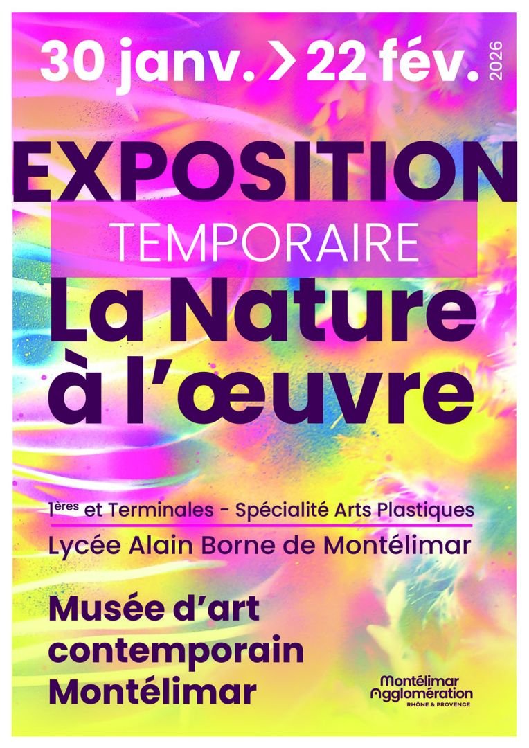 Du 30 janvier au 22 févirer 2026, les élèves de premières et de terminales du lycée Alain Borne de Montélimar vous propose une exposition temporaire "La Nature à l'Oeuvre" au musée d'art contemporain.